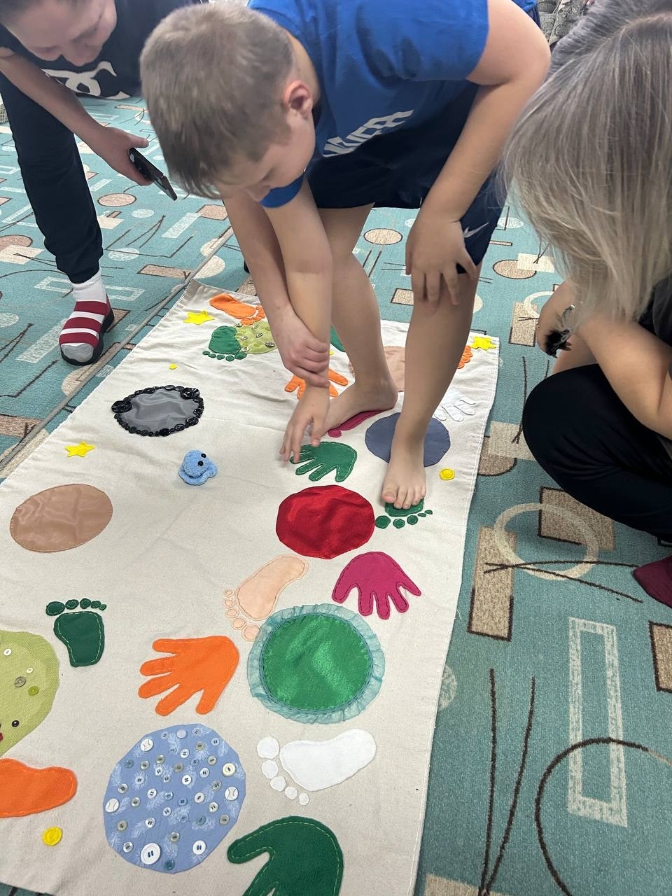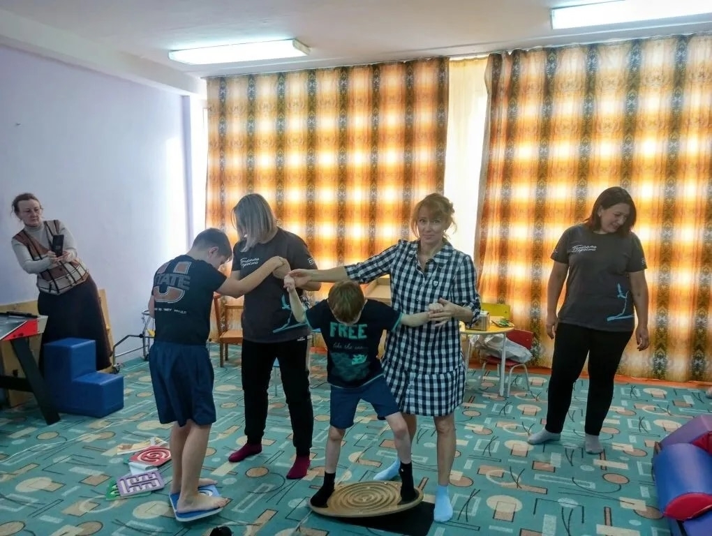 В подвижной части прошли ножками и ручками по нейрокосмическому коврику среди планет и звёзд, выполнили упражнения на балансире. Дети поочерёдно стояли на балансировочной доске, стараясь удержать равновесие, а родители помогали им. Некоторые участники выполняли задания с дополнительными элементами: нужно было провести шарик по лабиринту от начала до конца.