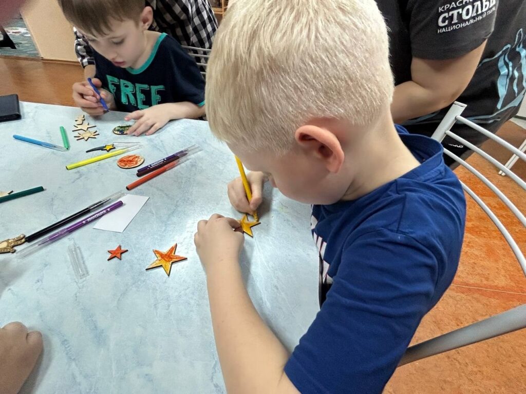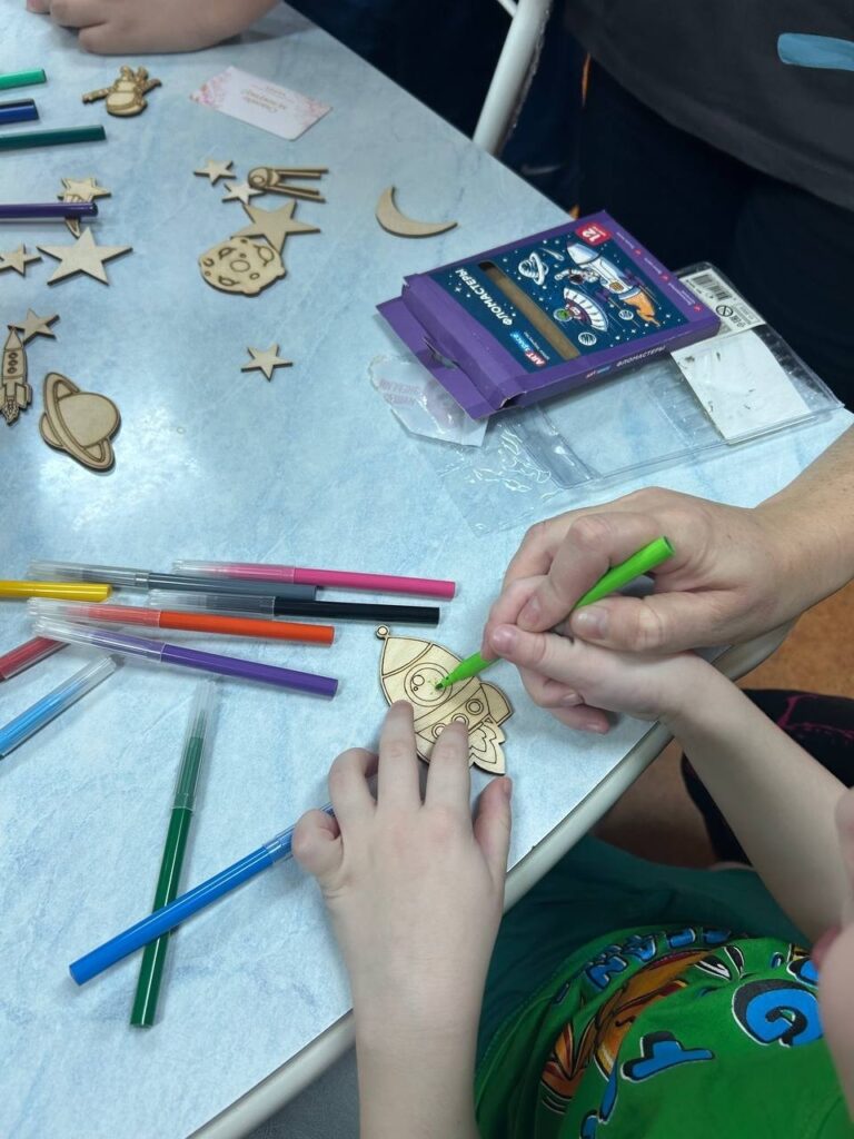 В творческой части закрепили знания, раскрасив деревянные фигурки звёзд, ракет, планет и спутников, которые можно будет повесить в декабре как украшение на новогоднюю елочку как напоминание об этой встрече.