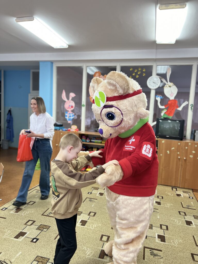 Медицинские волонтеры посетили центр, чтобы порадовать ребят. Главным героем встречи стал очаровательный медвежонок-медик, который не только поздравил детей с наступающими праздниками, но и угостил их сладостями.