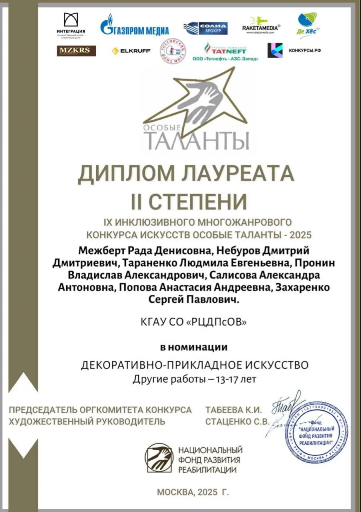 Дипломы, полученные на конкурсе, стали достойным признанием труда участников мастерской. Проект «Особые таланты» даёт мастерам ценную возможность делиться опытом, находить новых зрителей и выводить изделия «Кудесницы» на общероссийский уровень.