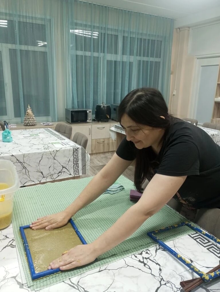 В семейной мастерской «Кудесница» прошло увлекательное занятие — участники освоили искусство изготовления бумаги из макулатуры и создали авторские зимние открытки.