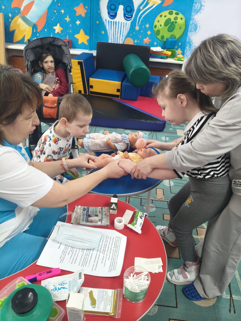 В ходе занятия дети из стационарного отделения и их родители на практике научились применять пластырь, йод, зеленку, бинты, попрактиковались в последовательности и правильности оказании первой помощи при ранах и порезах, а также научились правильно вызывать «Скорую помощь». Все присутствующие с интересом рассматривали содержимое домашней аптечки. Приобретенные в ходе мероприятия навыки в дальнейшем помогут детям справиться с различными ситуациями.